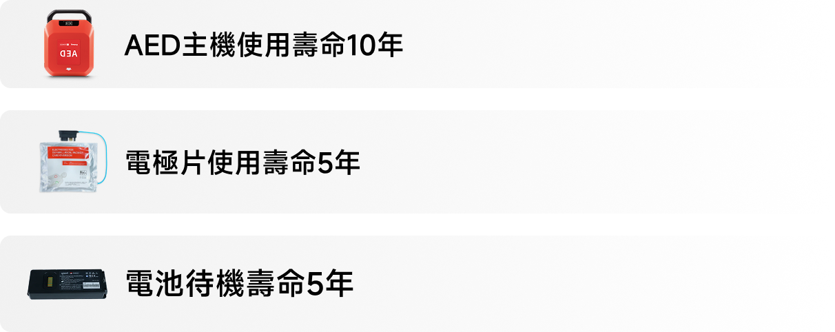 具備自動自檢功能,隨時確保設備處於可用狀態,電池插入 / 開機 / 每日 / 每週 / 每月 / 半年自檢;涵蓋主控模組 / 電池 / 電源 / 電極片等。